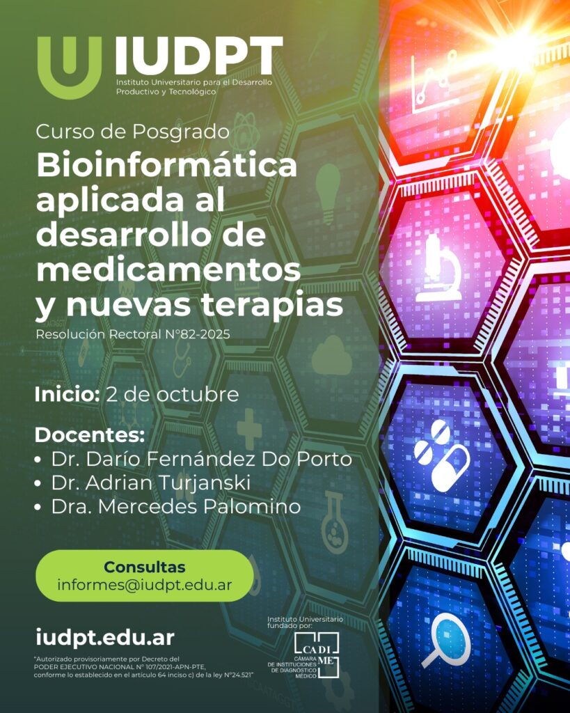 El curso de posgrado Bioinformática aplicada al desarrollo de medicamentos y nuevas terapias ofrece un recorrido formativo que integra la bioinformática estructural y la bioinformática aplicada al desarrollo de fármacos. Su propósito es brindar una visión completa del proceso que conecta la exploración genómica con la caracterización estructural de blancos terapéuticos y la evaluación de interacciones con compuestos químicos, en el marco del diseño racional de nuevas terapias. A lo largo de la cursada, los estudiantes se familiarizarán con la integración de datos genómicos y multi-ómicos para la identificación y priorización de blancos moleculares, así como con la representación y estudio de redes metabólicas que permiten comprender el contexto funcional de dichos blancos. Se abordarán conceptos de CRISPR/CRISPRi para la validación experimental de blancos, incluyendo el uso de herramientas bioinformáticas para el diseño de guías de ARN que permitan silenciar o modular específicamente la expresión de genes candidatos. En la etapa de interacción fármaco–blanco, se profundizará en métodos de docking proteína–ligando, identificación de residuos clave (hot-spots) y el uso de dinámica molecular para evaluar estabilidad y comportamiento de complejos. De esta manera, se brindan competencias para seleccionar y aplicar herramientas bioinformáticas de última generación, interpretar críticamente los resultados y proponer estrategias de optimización de candidatos terapéuticos. En conjunto, el curso constituye una base sólida para la participación en proyectos de descubrimiento de drogas en entornos académicos, biotecnológicos y farmacéuticos.