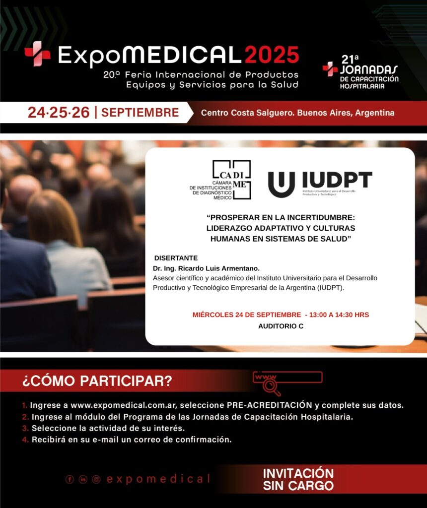 Desde IUDPT y CADIME, nos complace invitarlo/a muy especialmente a participar de esta conferencia a cargo del Dr. Ing. Ricardo Luis Armentano, Asesor Científico y Académico del IUDPT, en el marco de ExpoMEDICAL 2025 y sus 21 Jornadas de Capacitación Hospitalaria.