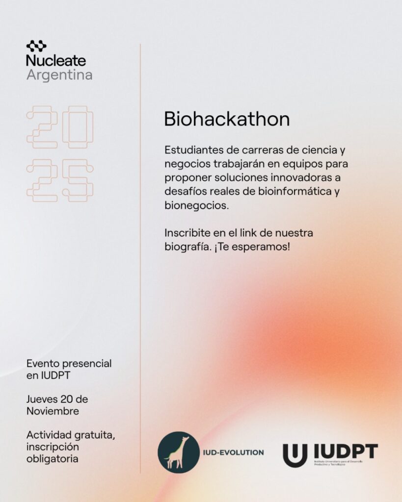 🧬 Llega el Biohackathon IUDPT + Nucleate Argentina, una jornada donde ciencia, tecnología y negocios se unen para resolver desafíos reales en bioinformática y bionegocios.
