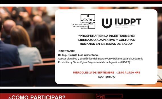 4 de Septiembre / 2025 Conferencia: Prosperar en la Incertidumbre 🎤 Conferencia: «Prosperar en la Incertidumbre» Liderazgo Adaptativo y Culturas Humanas en Sistemas de Salud ➡️ Desde IUDPT y CADIME, nos complace invitarlo/a muy especialmente a participar de esta conferencia a cargo del Dr. Ing. Ricardo Luis Armentano, Asesor Científico