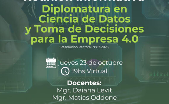 8 de Octubre / 2025 🚀 Transformación Digital Empresarial ¡Preparate para liderar la transformación digital en tu empresa! Te invitamos a la Reunión Informativa de la Diplomatura en Ciencia de Datos y Toma de Decisiones para la Empresa 4.0 📅 Jueves 23 de octubre – 19 hs 💻 Modalidad virtual