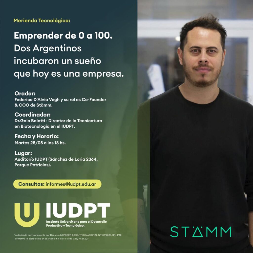 Federico D’Alvia Vegh, Co-fundador y COO de Stämm llega al IUD para contarnos como fue el proceso de su sueño. Stämm Biotech fue fundada por dos primos hace menos de una década, e innova con sus biorreactores que conjugan microfluídica e impresión 3D. Este desarrollo 100% nacional se encuentra en plena expansión a varias partes del mundo.